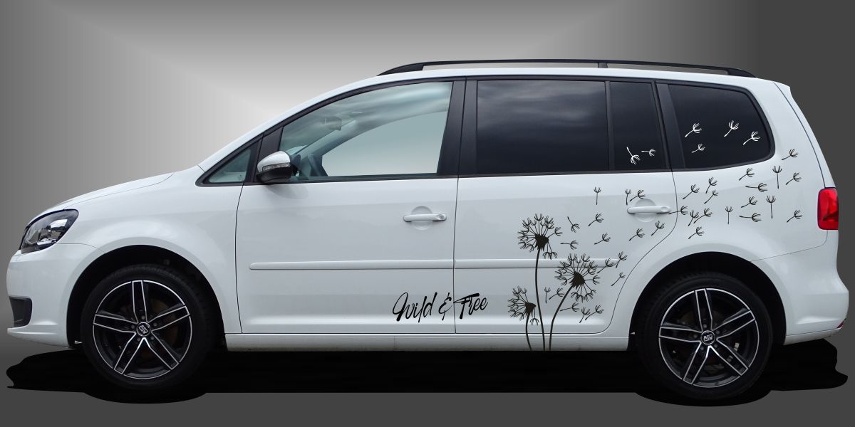 Das Design Autofolie Pusteblume passt besonders zu Fahrzeugen mit flachen oder leicht gewölbten Seitenflächen. Dank der modularen Struktur lässt sich das Motiv flexibel positionieren.