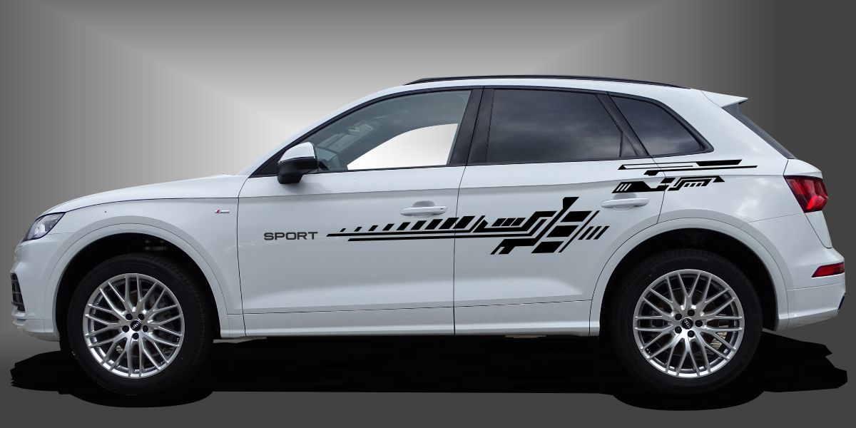Das Design Autofolie Seitendekor passt besonders zu Fahrzeugen mit flachen oder leicht gewölbten Seitenflächen. Dank der modularen Struktur lässt sich das Motiv flexibel positionieren.