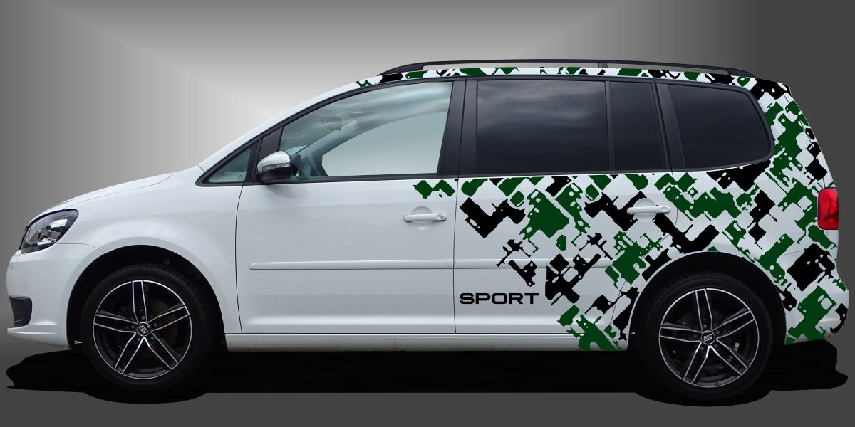 Das Design Camouflage Autodekor passt besonders zu Fahrzeugen mit flachen oder leicht gewölbten Seitenflächen. Dank der modularen Struktur lässt sich das Motiv flexibel positionieren.