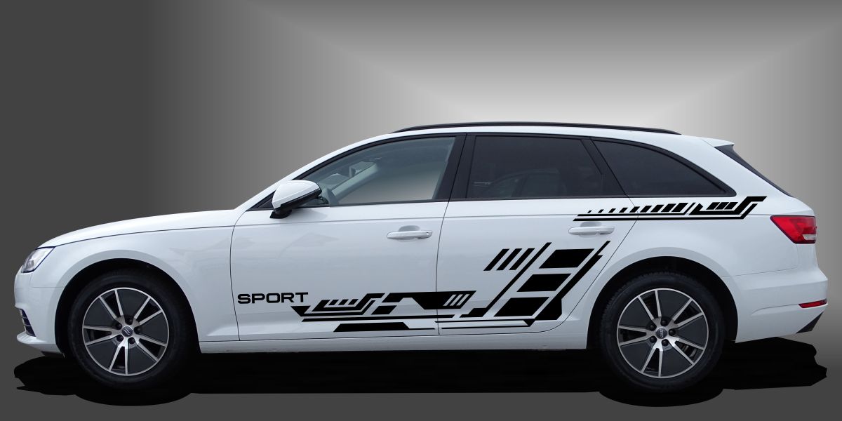 Das Design Motorsport Aufkleber passt besonders zu Fahrzeugen mit flachen oder leicht gewölbten Seitenflächen. Dank der modularen Struktur lässt sich das Motiv flexibel positionieren.