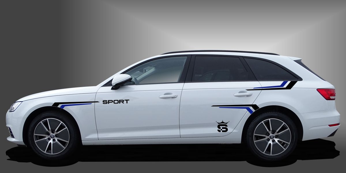 Das Design sportliche Seitenaufkleber passt besonders zu Fahrzeugen mit flachen oder leicht gewölbten Seitenflächen. Dank der modularen Struktur lässt sich das Motiv flexibel positionieren.