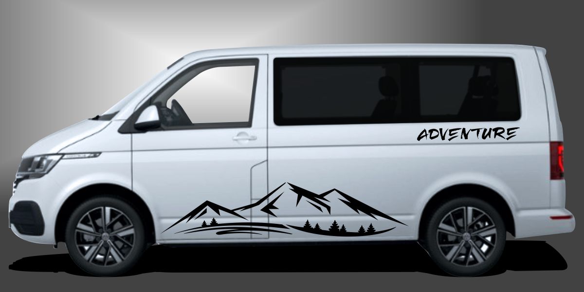 Das Design T6 Aufkleber Berge passt besonders zu Fahrzeugen mit flachen oder leicht gewölbten Seitenflächen. Dank der modularen Struktur lässt sich das Motiv flexibel positionieren.