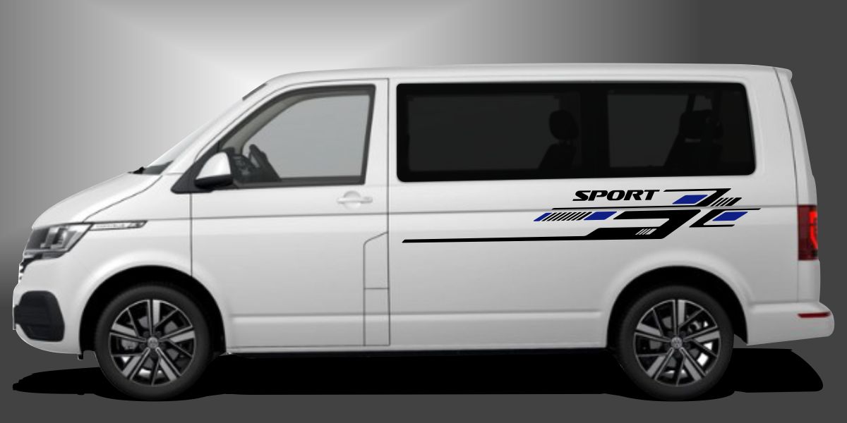 Das Design T6 Bus Tuning Aufkleber passt besonders zu Fahrzeugen mit flachen oder leicht gewölbten Seitenflächen. Dank der modularen Struktur lässt sich das Motiv flexibel positionieren.